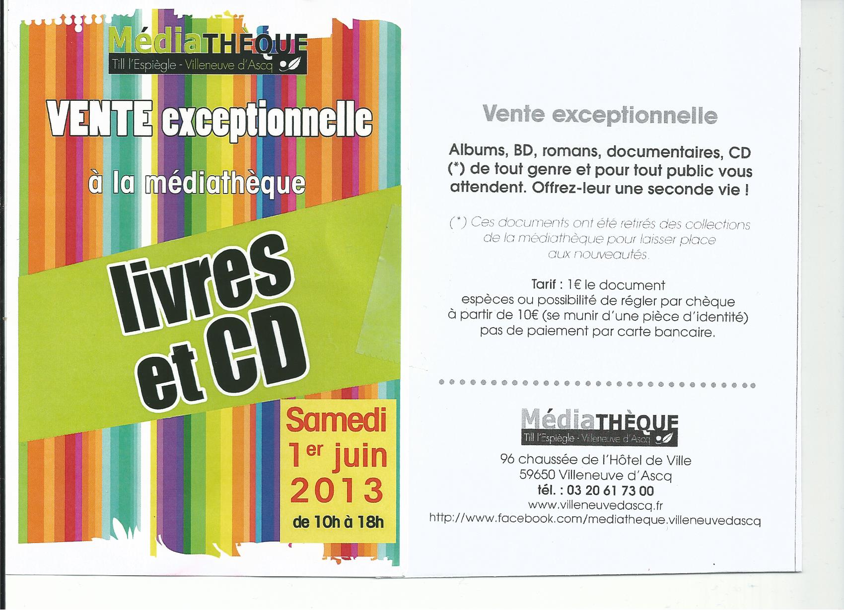 Vente exceptionnelle à la médiathèque ce 1er juin 2013 La médiathèque organise une vente de livre : voir le flyer ci-dessous !